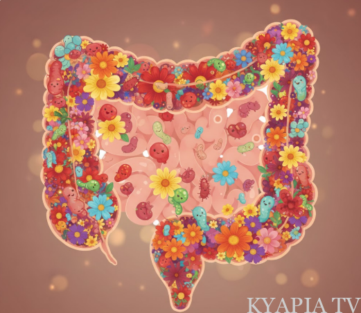 健康な腸: 色とりどりの花が咲くお花畑(腸内フローラ)
