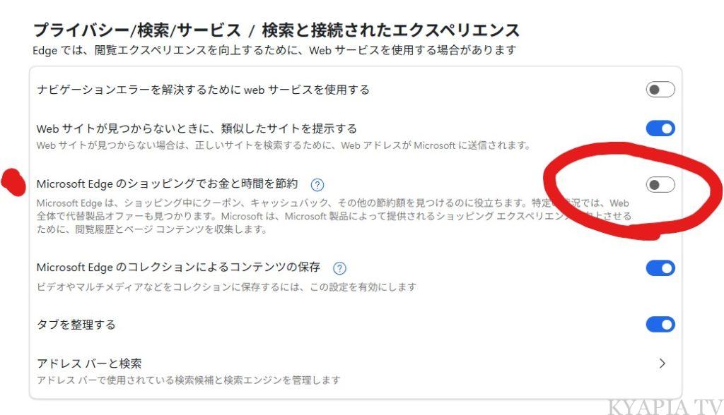 「Microsoft Edge でのショッピングでお時間とお金を節約する」という項目をオフにする。