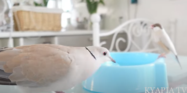 押しの強いジュズカケバト、ピッポ君とマイペースなシナモン文鳥マロンちゃん❤